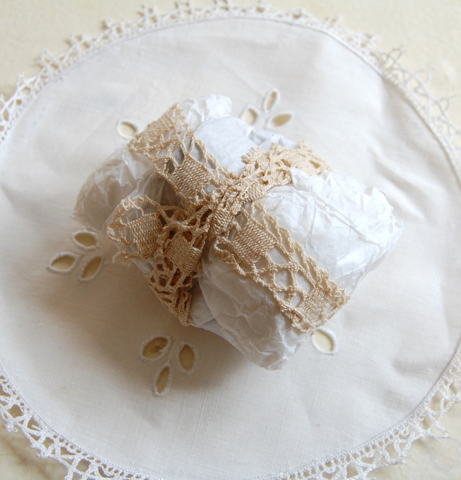 手のひらにチョコンと乗るくらいのとても小さな包みです。アンティークレースのリボンで巻かれていました。レースのリボンをそっと解いて、中を開けてみると・・・