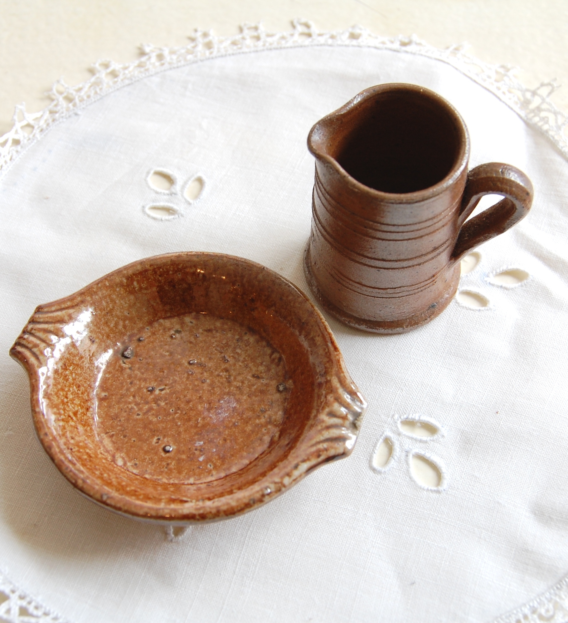 とっても可愛いミニミニサイズのピッチャーとお皿です。別にセット、というわけではないのですが(色合い、質感などはそれぞれ違っています)、こうして並べてみると意外と合うかも・・・?と思いました。小さなクリーマーくらいの大きさのピッチャーですが、小花なんかを入れて飾っても可愛いですね。