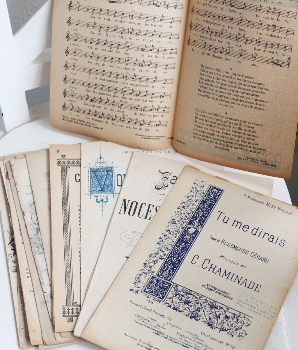美しいデザインの表紙がとても趣きがある(そのまま額に入れて飾りたくなるようなデザインのものが多いです!)、古い楽譜たち・・・。クラシックやシャンソンなど、色々なジャンルの楽譜がありますが、古い紙の質感や、美しいフォントや絵柄など・・・、どれもとても素敵なものばかり!