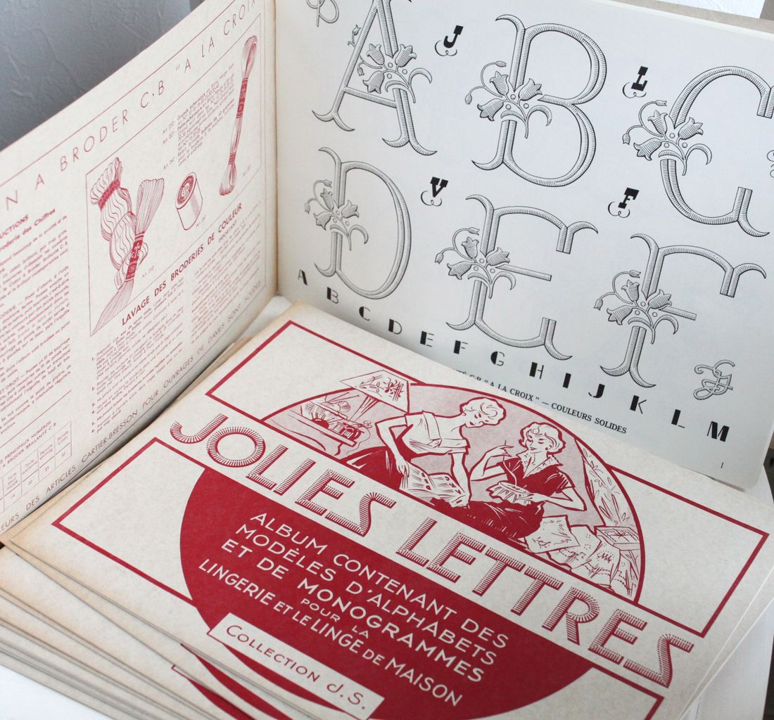 イニシャルやモノグラムの図案がたくさん載っている「JOLIES LETTRES」です。行きつけの古本屋さんで、デッドストックで状態の良いものをたくさん見つけました!